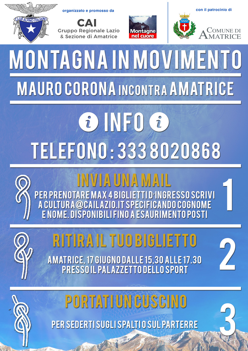 Ancora posti disponibili per lo storico incontro di Mauro Corona ad Amatrice. Non servono ulteriori presentazioni di una serata alp molto speciale in un luogo così ferito e che vuole scuotersi dal silenzio e dalla sofferenza. Basta inviare una mail a cultura@cailazio.it e prenotare con il proprio cognome il biglietto gratuito fino a esaurimento posti liberi (entro stasera alle 18.00). L’evento è Sabato 17 giugno, Palazzetto delle Sport ore 18.00. Ulteriori info www.cailazio.it e www.caiamatrice.it |
