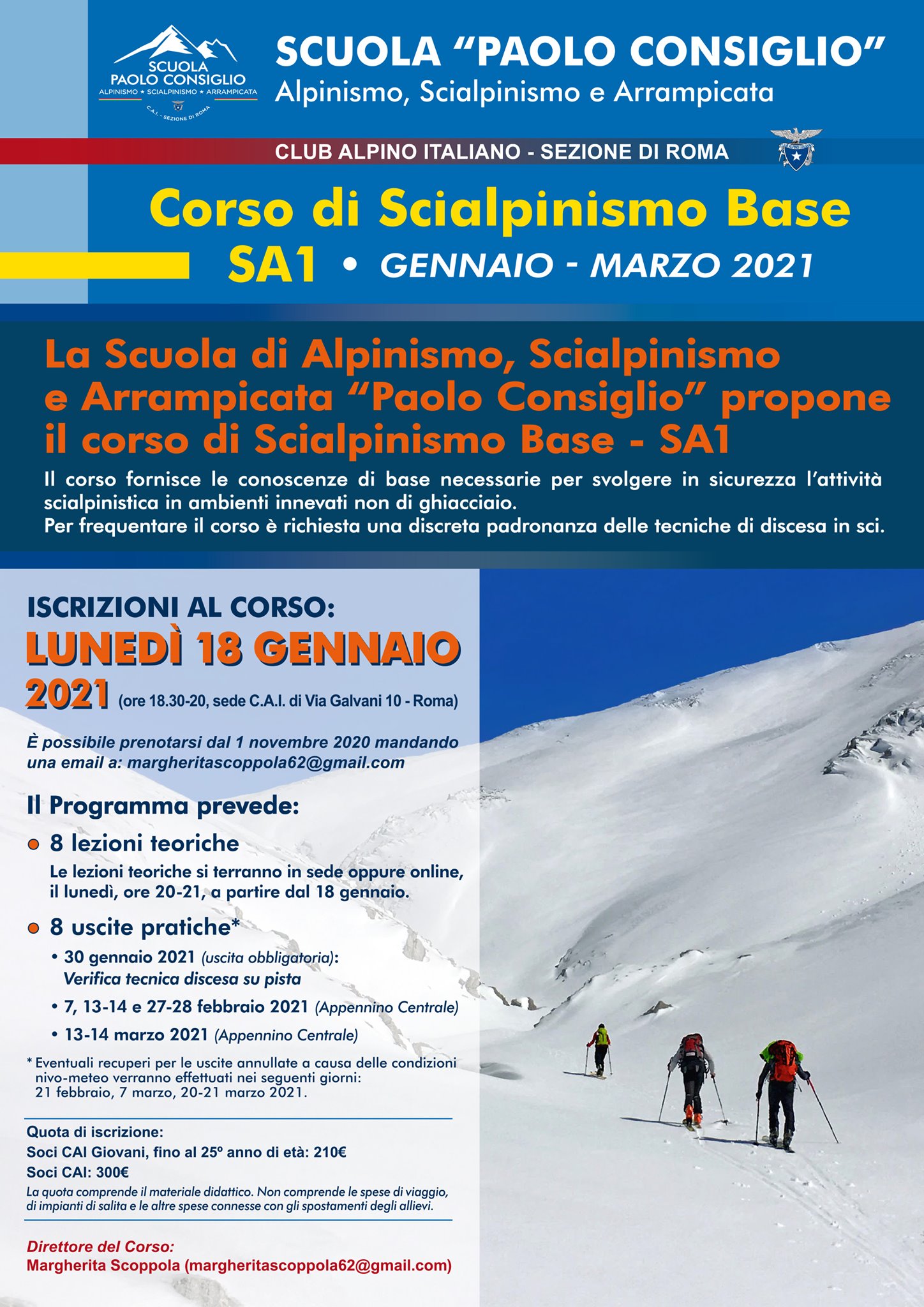 La Scuola “Paolo Consiglio” propone, per l’imminente stagione invernale, il Corso di Scialpinismo Base – SA1, che avrà inizio il 18 gennaio 2021, presso la sede del CAI – Roma, di Via Galvani, 10.